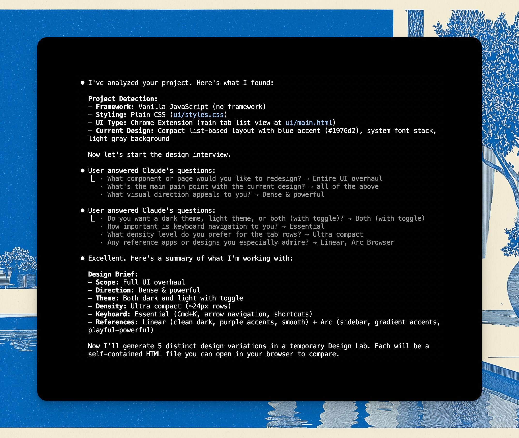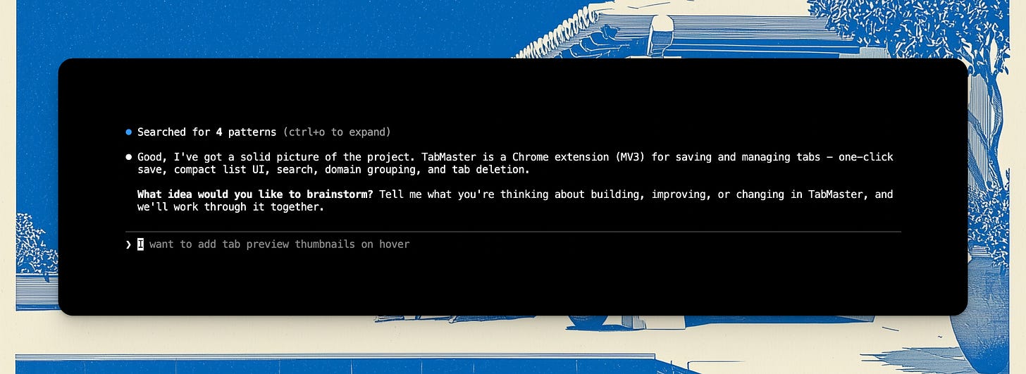 We’re working in my TabMaster Chrome Extension that I built for myself, and the first nice thing it does is it studies the repo to understand it: