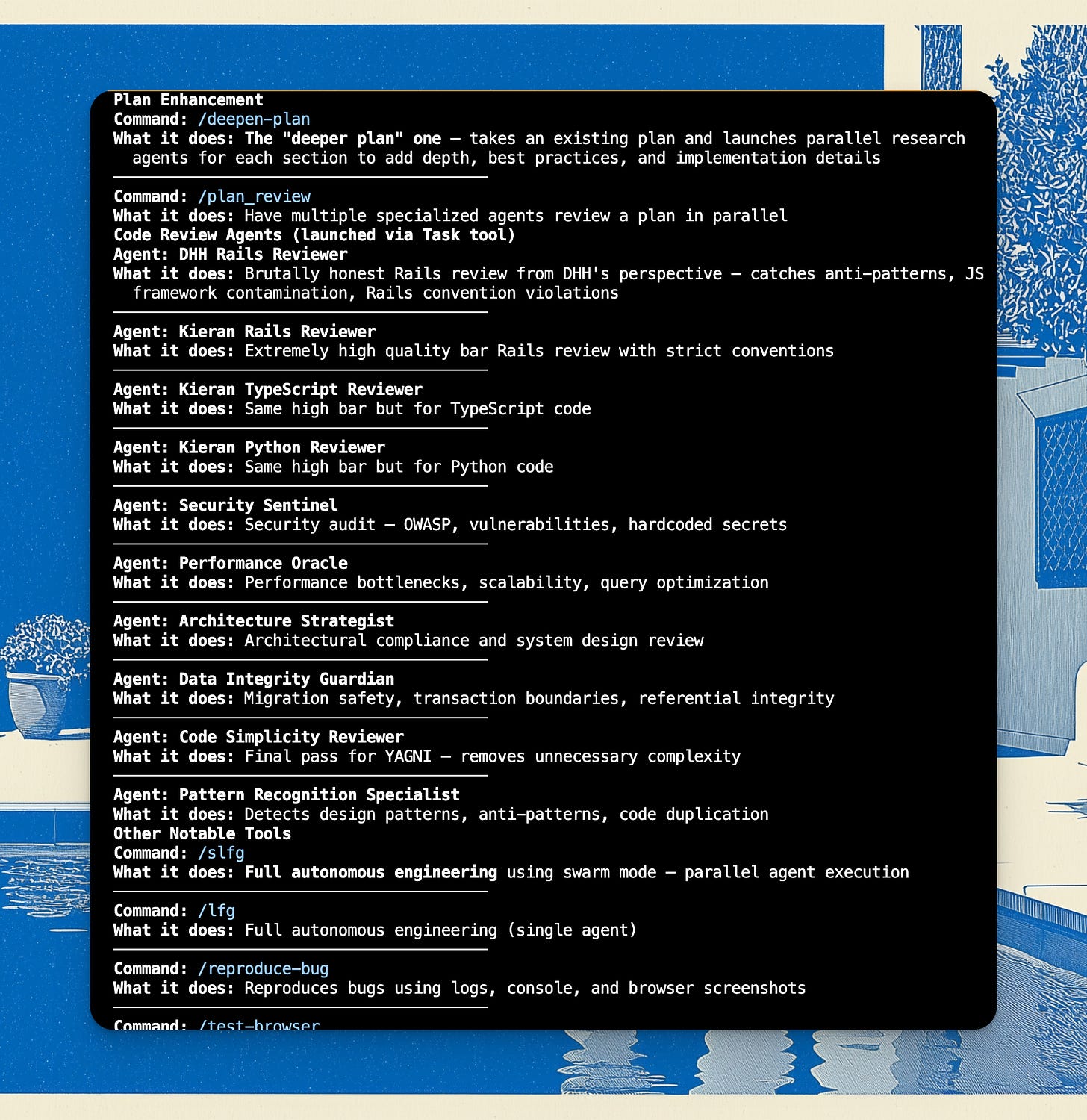 As you can see, they all have something in common again: you start with a brainstorm, you create a plan, you do the work; but in this case it also adds a skill for doing a review as well, as the compound skill, from which it borrows its name from — basically a post-review documentation step, that helps you & Claude Code document what didn’t work in the code base, so that next time you’re able to not repeat the same mistakes.